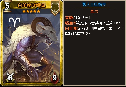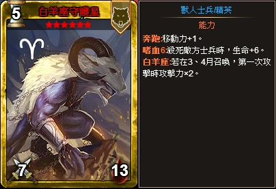 累計儲值滿1萬金幣時可獲得:白羊座守護星(傳說)一張